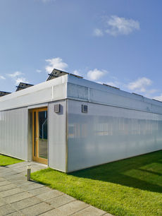 Los elementos de fachada se extienden a través de dos habitaciones, son prefabricados, y su tamaño fue determinado por las dimensiones máximas adecuadas para el transporte.